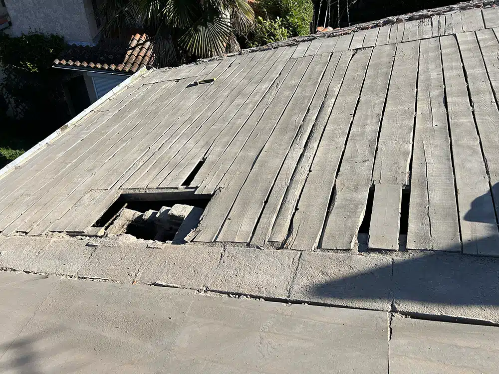 • Dépose complète des éléments existants : tuiles, liteaux nettoyage de la charpente.